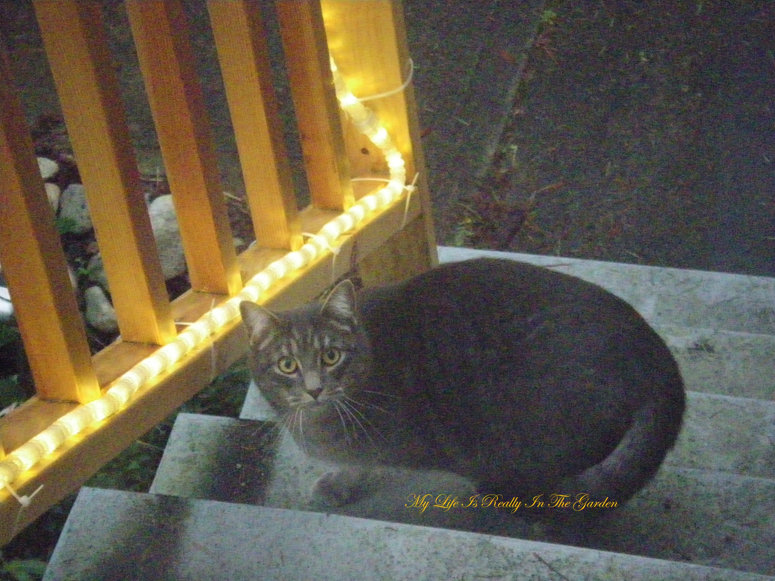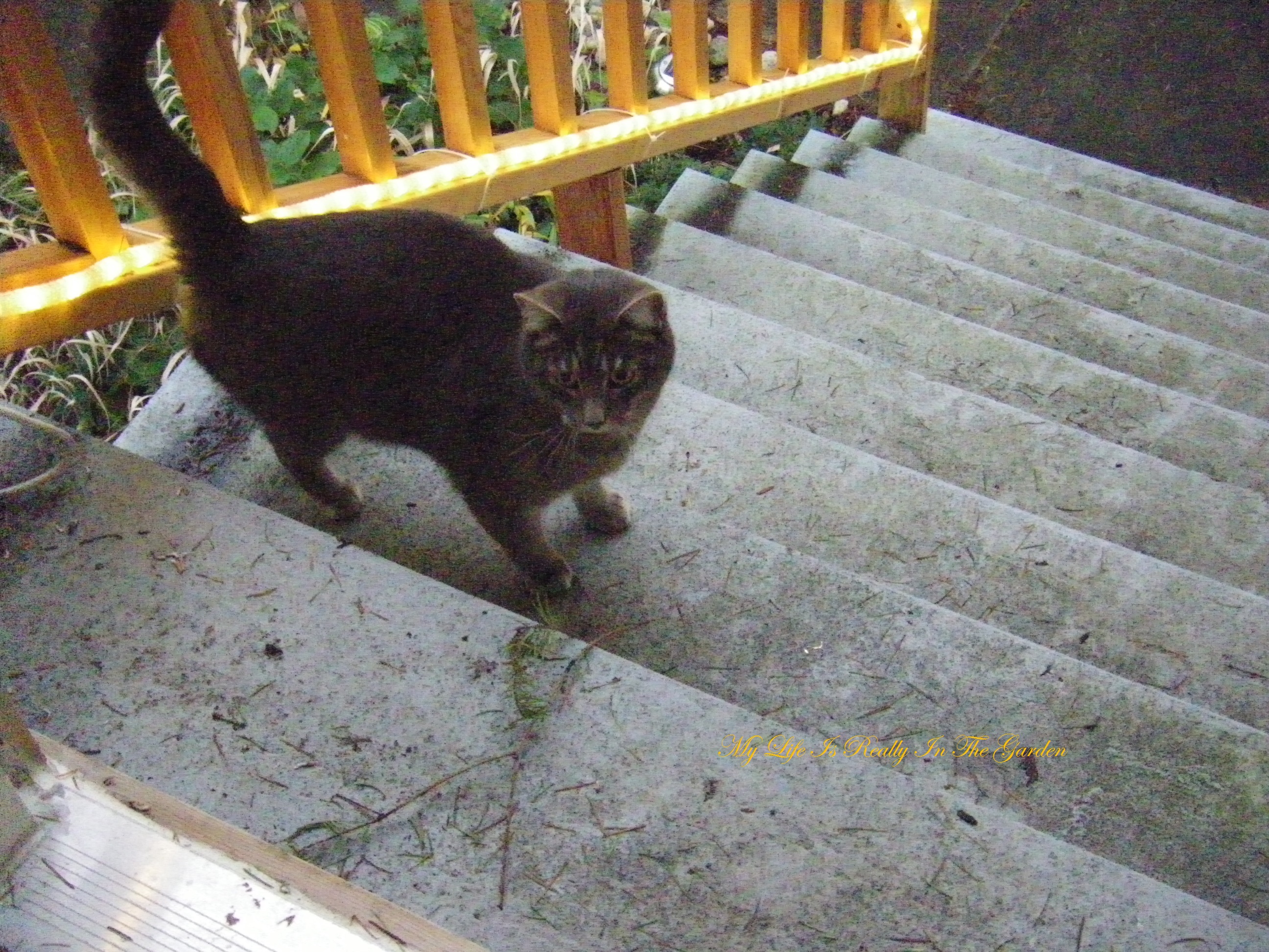Next, at the front of the house, I’m just about ready to leave when I notice a neighbour’s cat .. very friendly … came up the front stairs … apparently quite ready to come inside for a visit. However, a branch from our Christmas tree appeared to capture his attention.