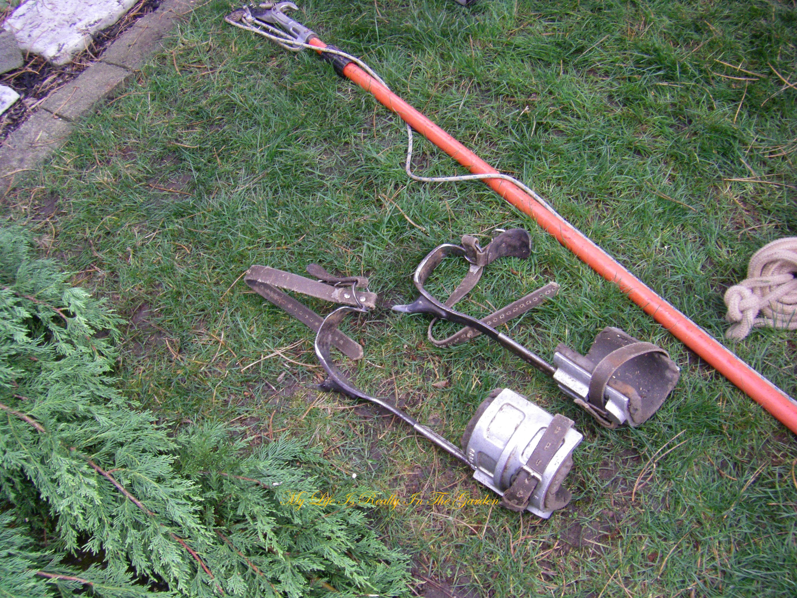 We recently had some intensive tree work done and I finally had a chance to see the professional climbing equipment that our friend, the arborist, used to climb the tall trees. Those are serious hooks and very necessary to ensure safety during the climb.