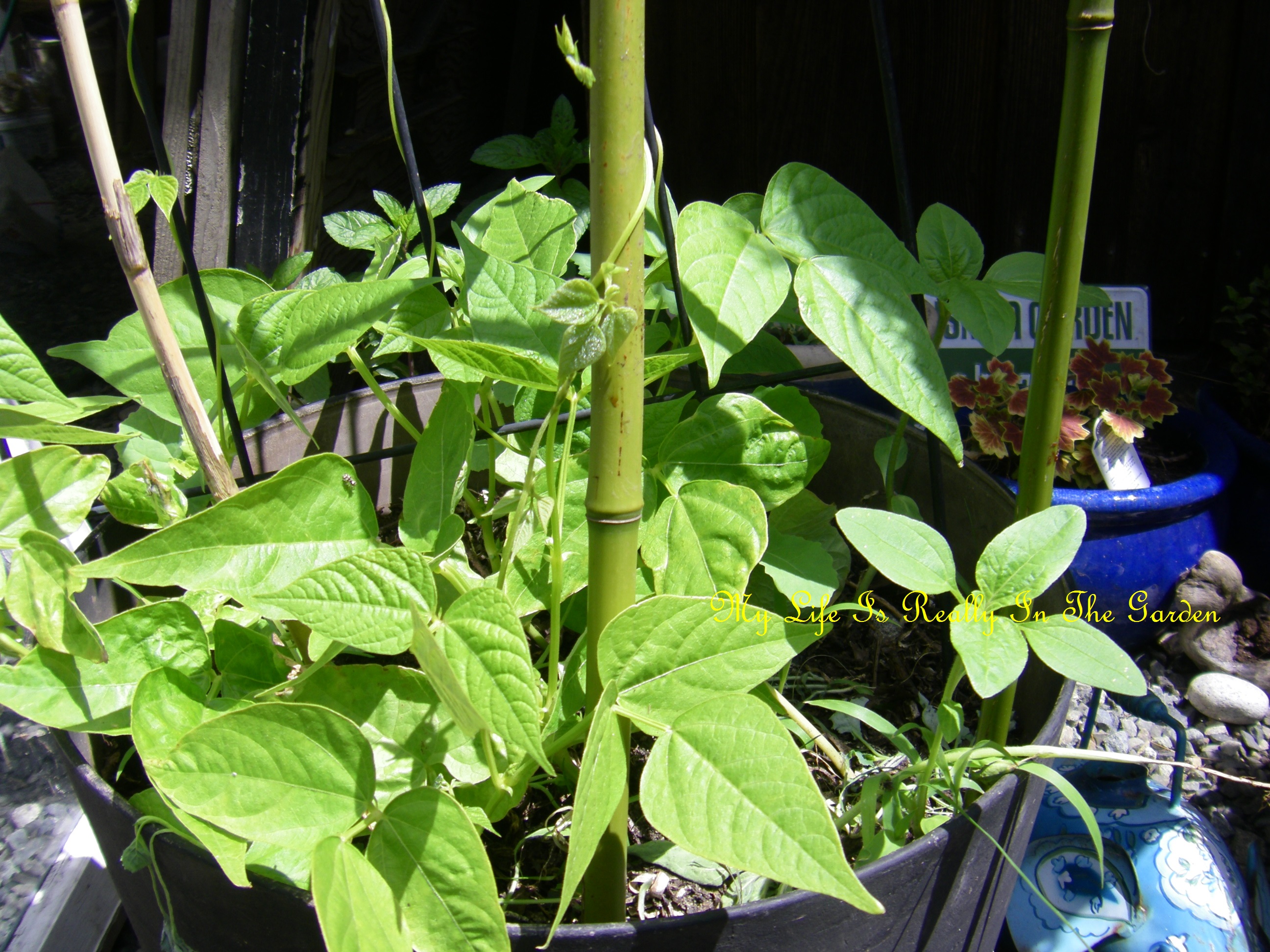 I placed some bamboo lengths in the “Kentucky Wonder Beans” and overnight they began climbing!!! The magic of nature at work.
