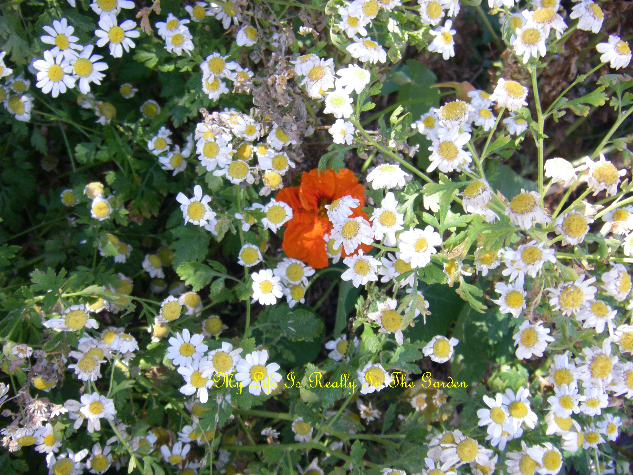 Colourful nasturtium flower peeking out from the feverfew ..