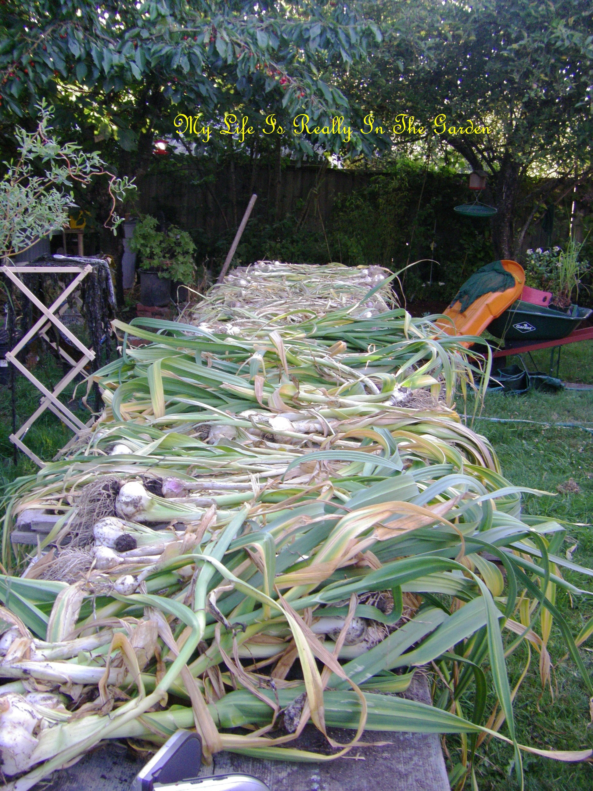 Garlic placed on makeshift work tables (2 work tables with framed lattice in between …resulting in a lot of space to work with. And I found an easy braiding recipe and will share those photos next time. They look rustic and I’m quite proud of them.