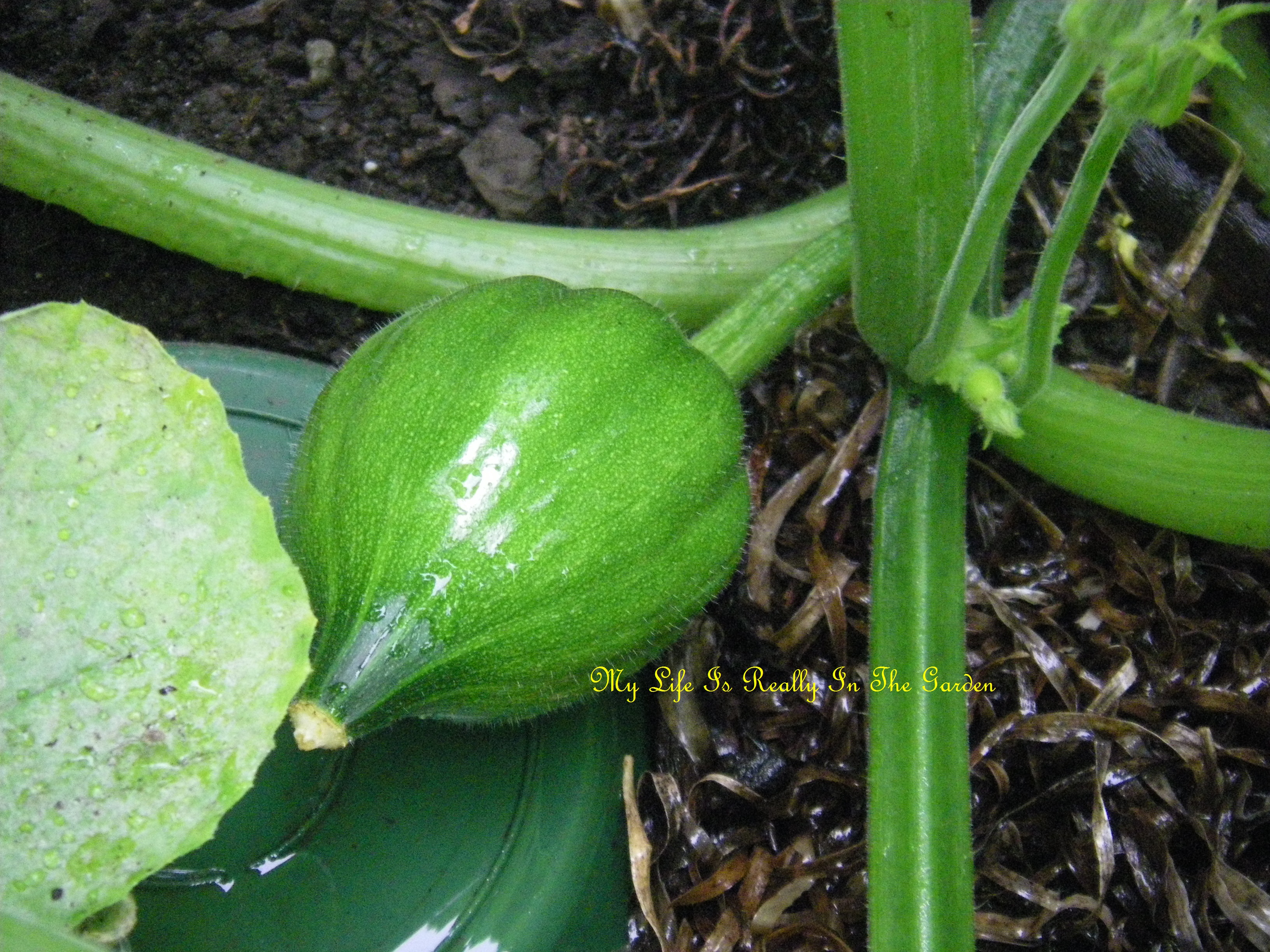 This is my first time at growing squash .. some sites state that long vines should be cut so that all of the strength would go into the growth of the squash. Being a timid soul, I didn’t do that .. thus this lovely little squash growing at the end of a long stem of vine. Hurrah!!