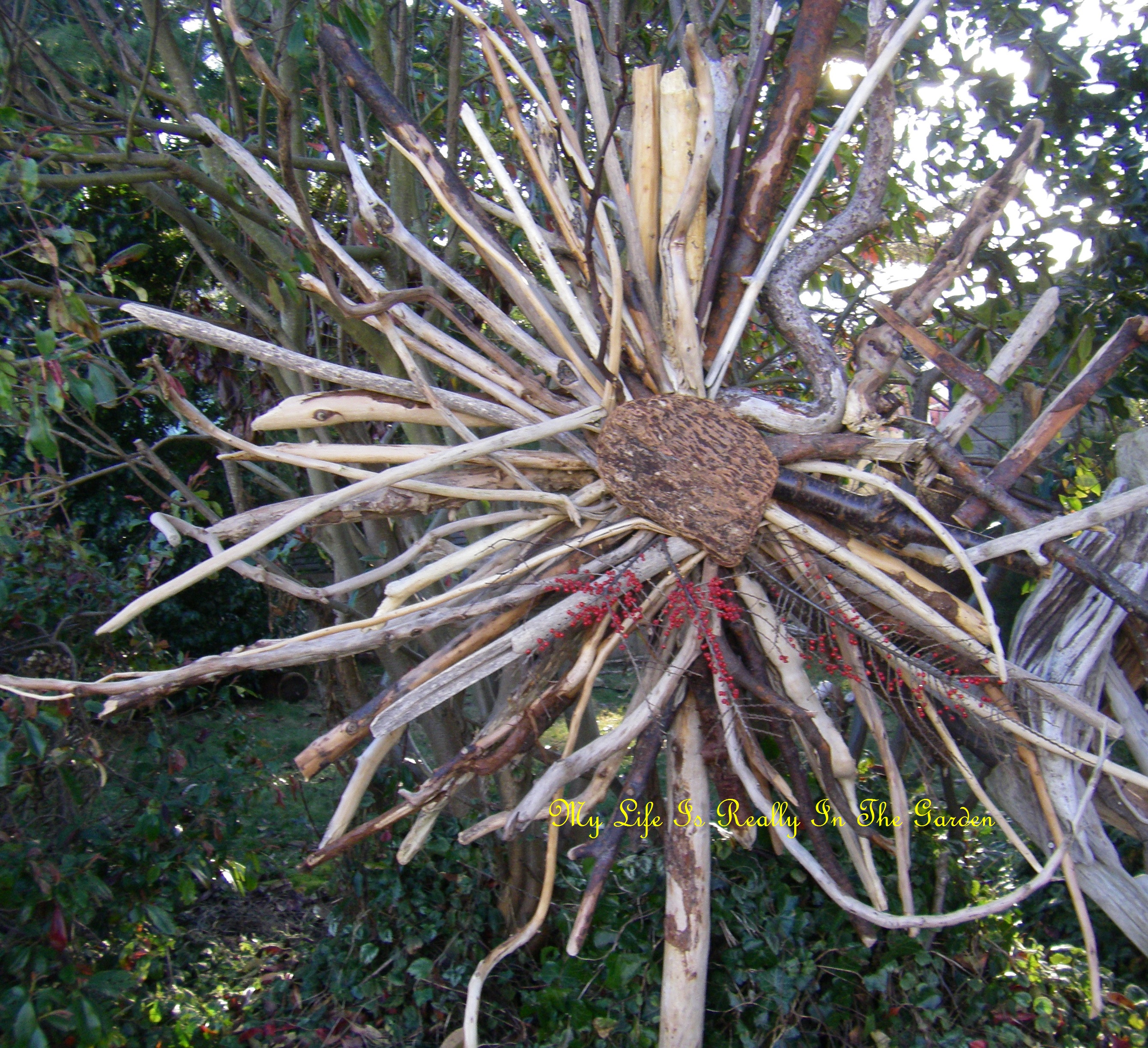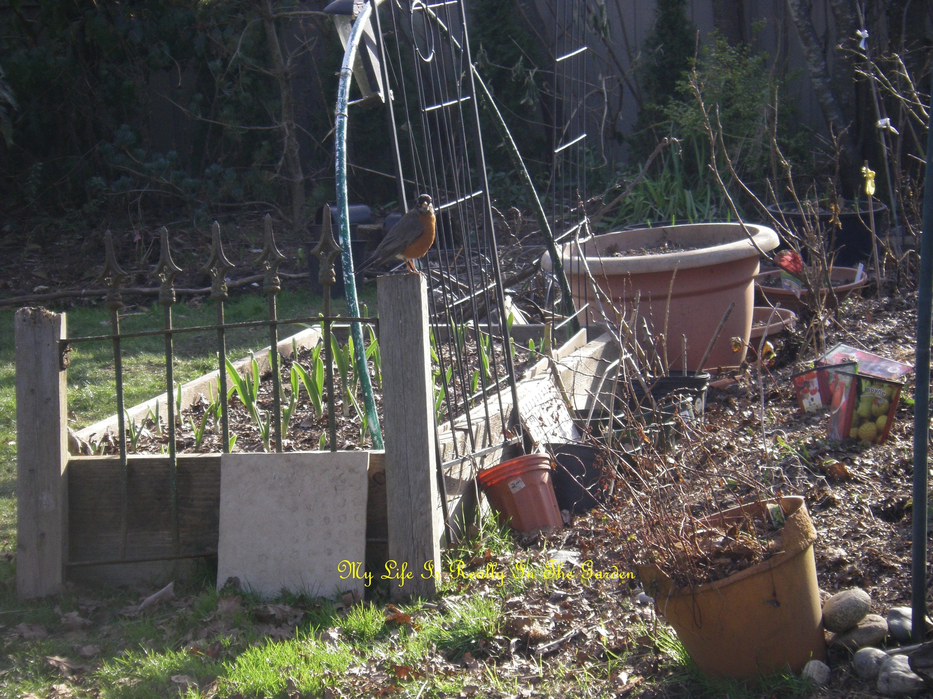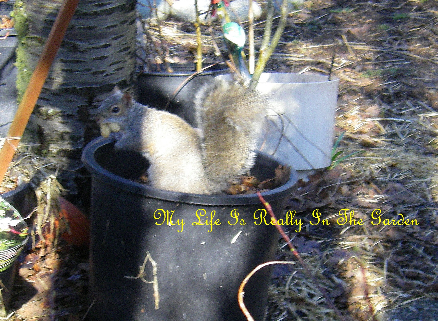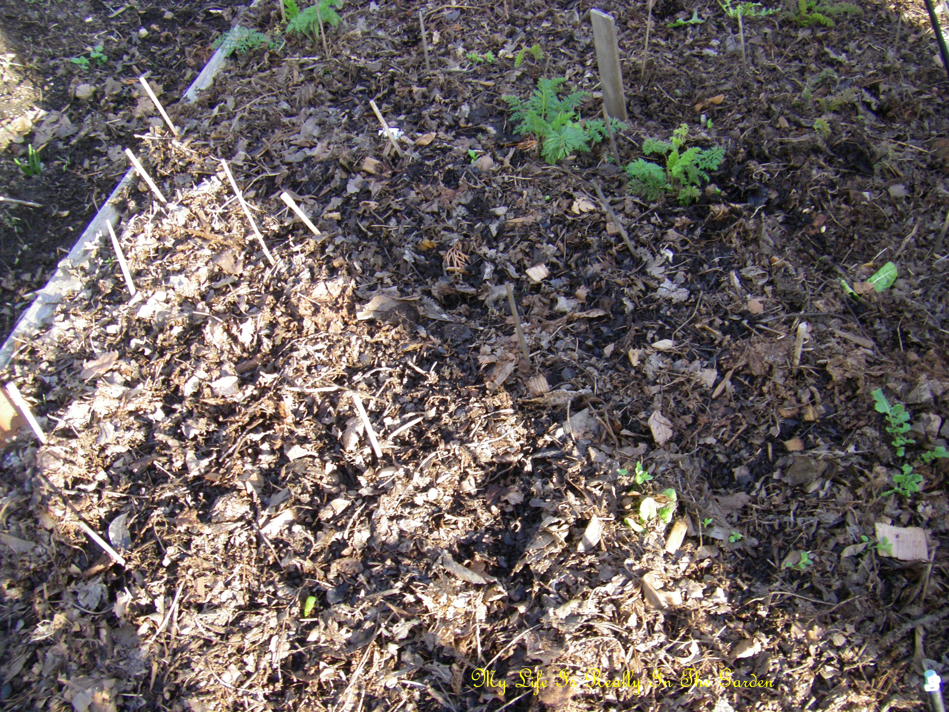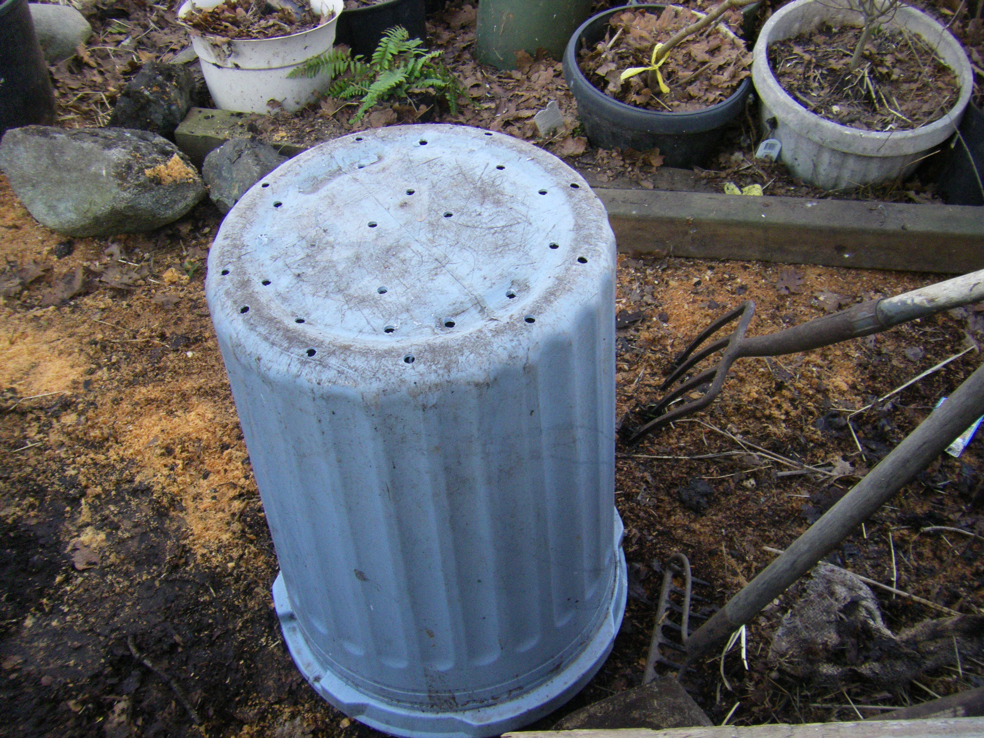 Then I spent a happy few hours, shifting leaf mulch/hay from an area where I had tucked a lot of potted plants into a protected area against the winter. Now it was time to move them aside and dig up the composting material. I drilled holes in the bottom of several waste bins …and later filled them up with the material. Lots of holes so the water can drain and breathe a bit, before I use this lovely stuff throughout the yard.