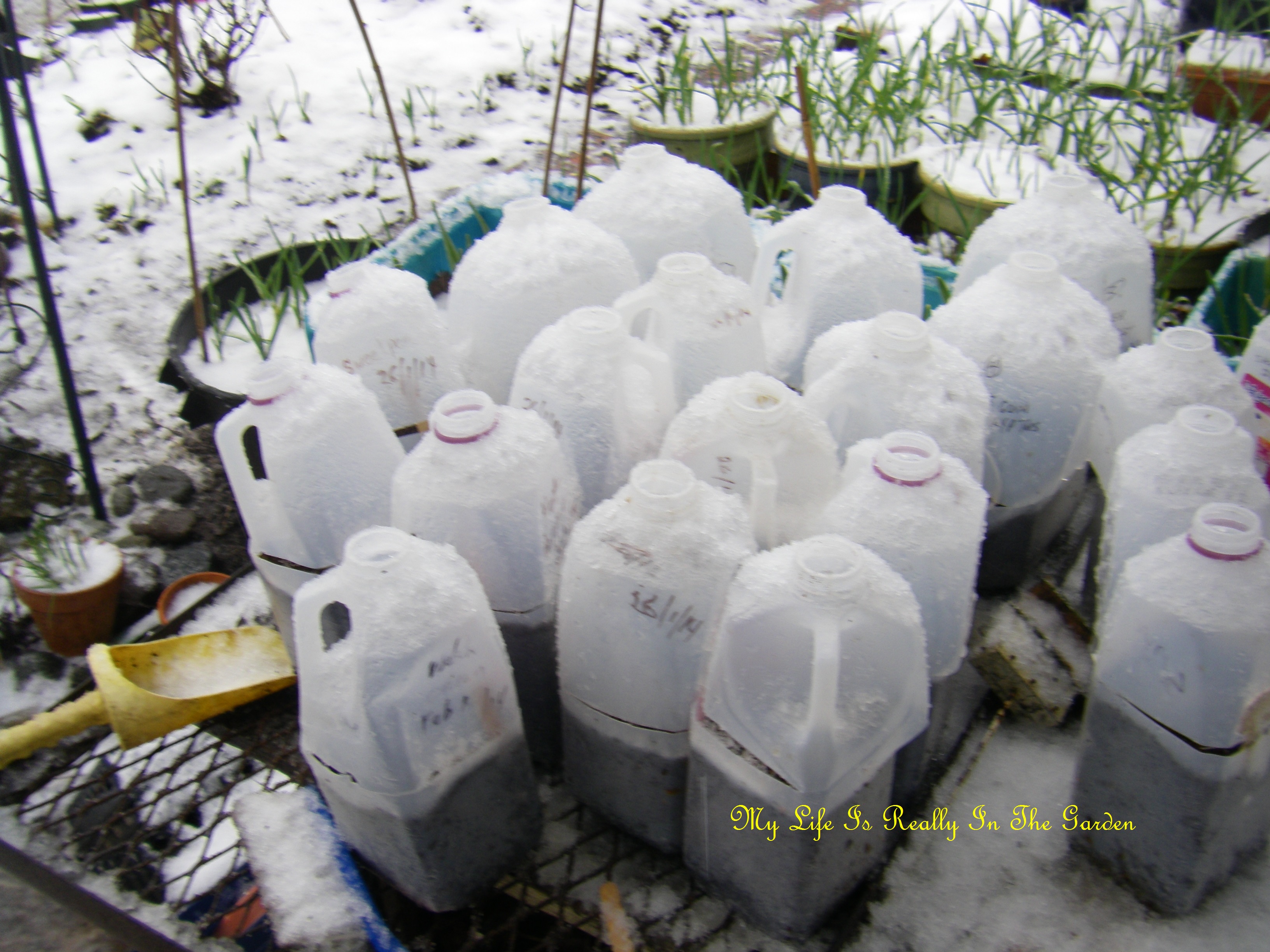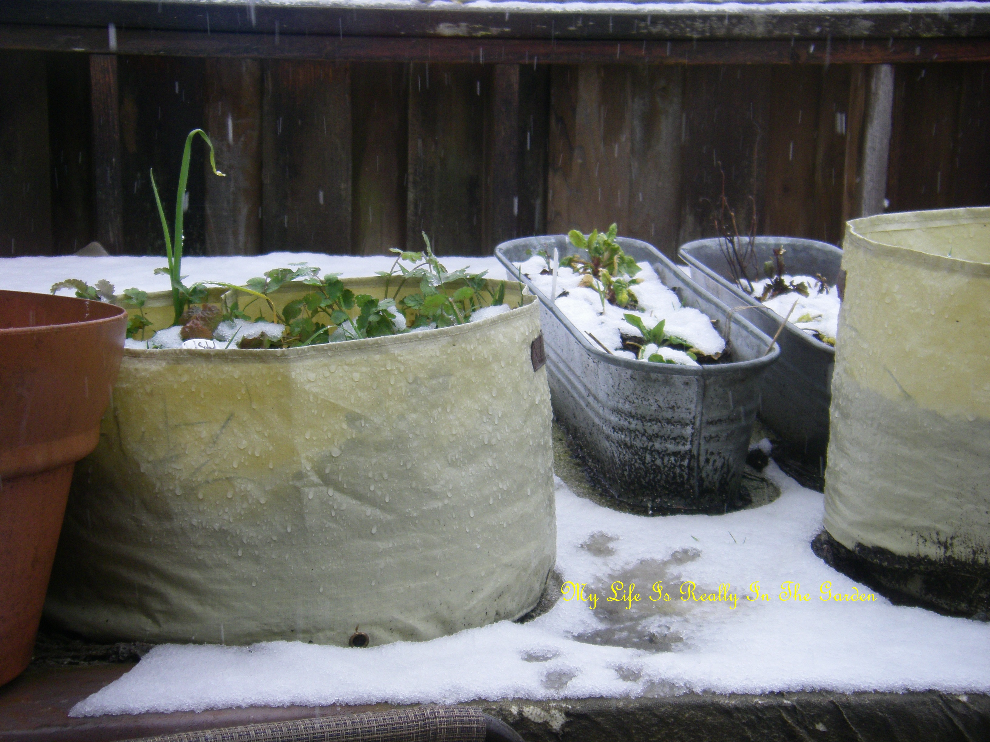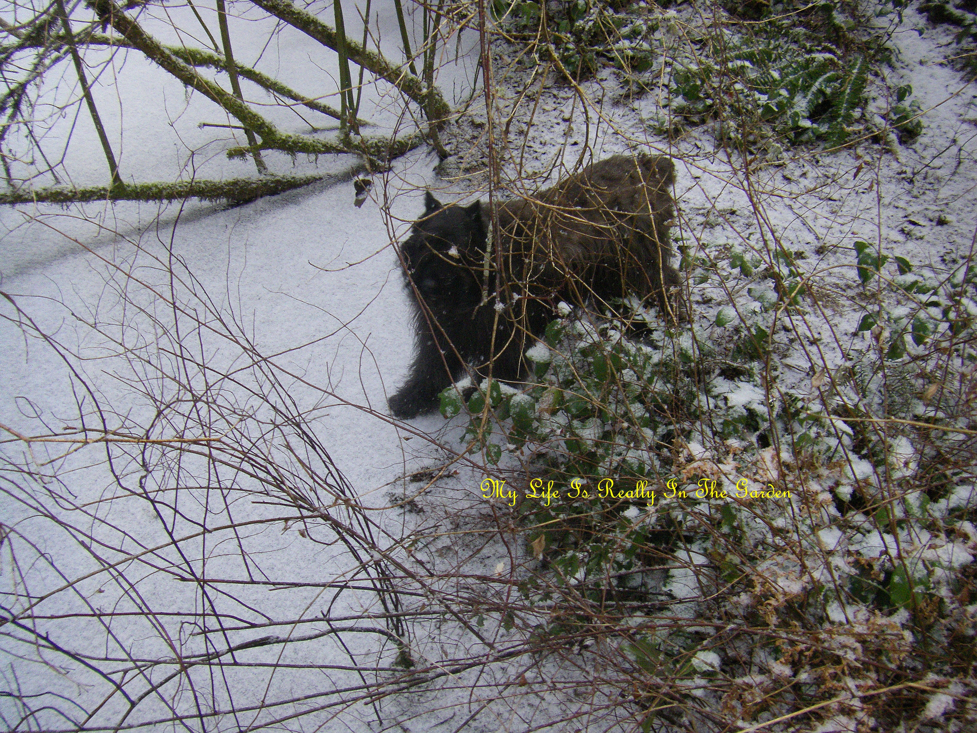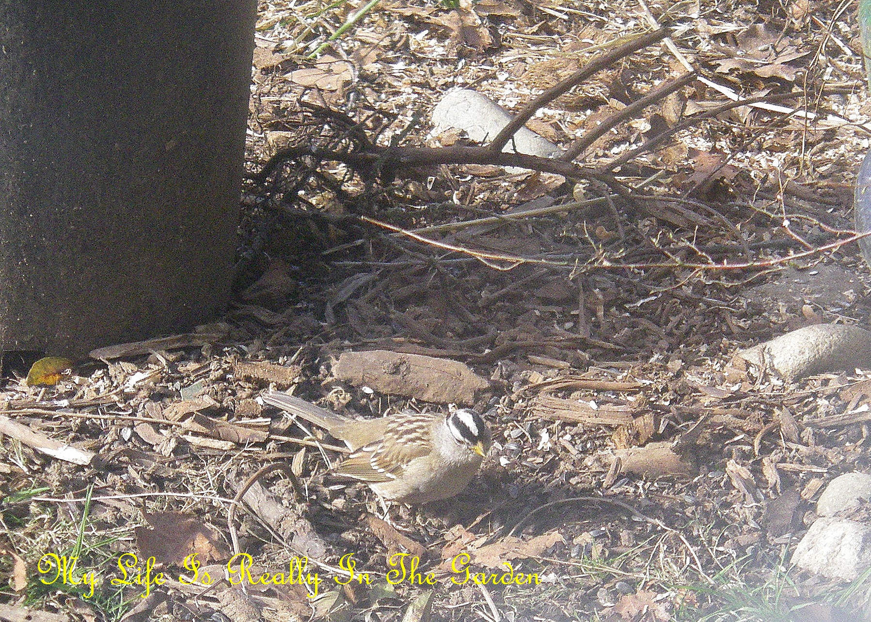 Then I spent a happy few hours, shifting leaf mulch/hay from an area where I had tucked a lot of potted plants into a protected area against the winter. Now it was time to move them aside and dig up the composting material. I drilled holes in the bottom of several waste bins …and later filled them up with the material. Lots of holes so the water can drain and breathe a bit, before I use this lovely stuff throughout the yard.