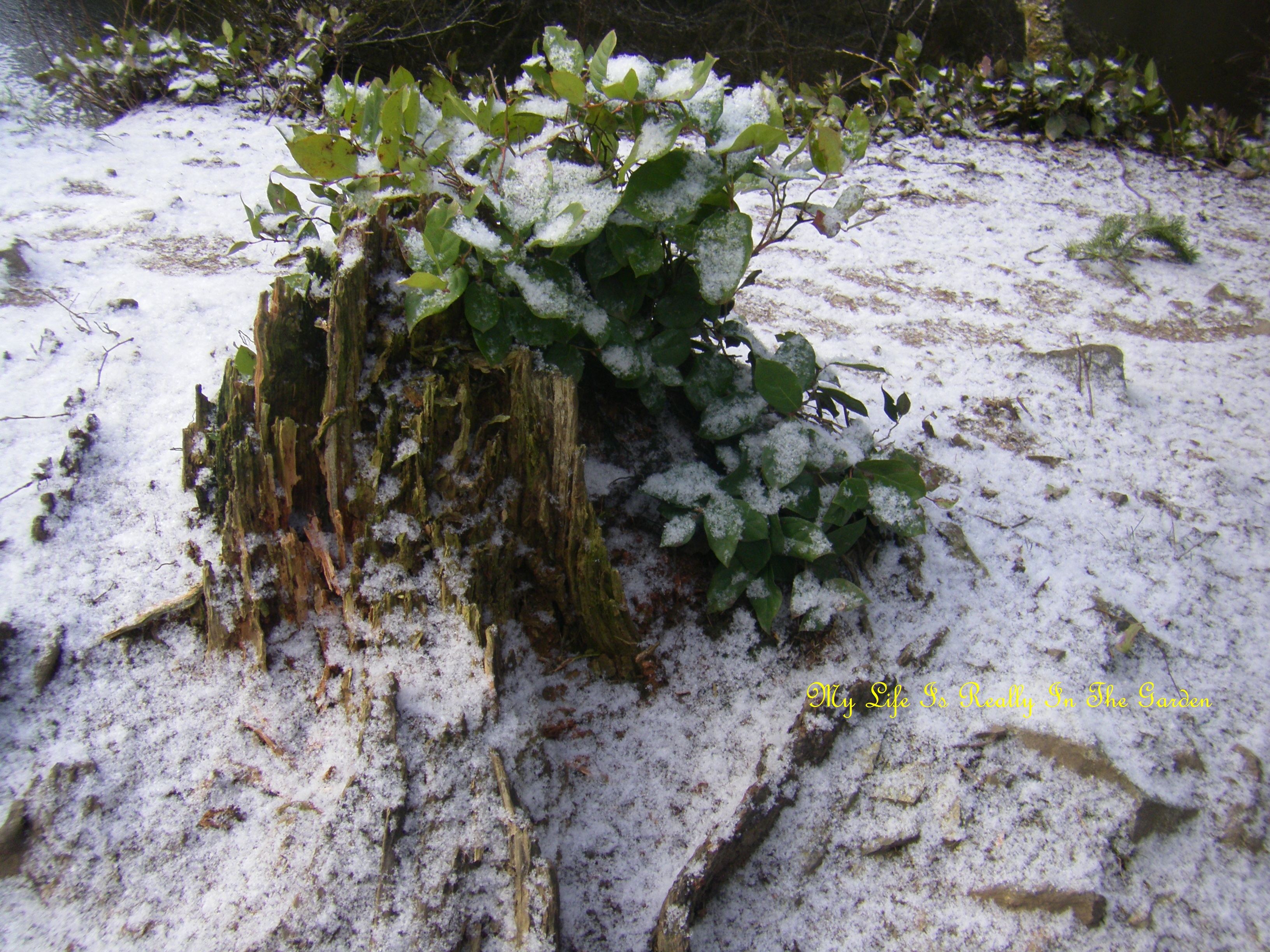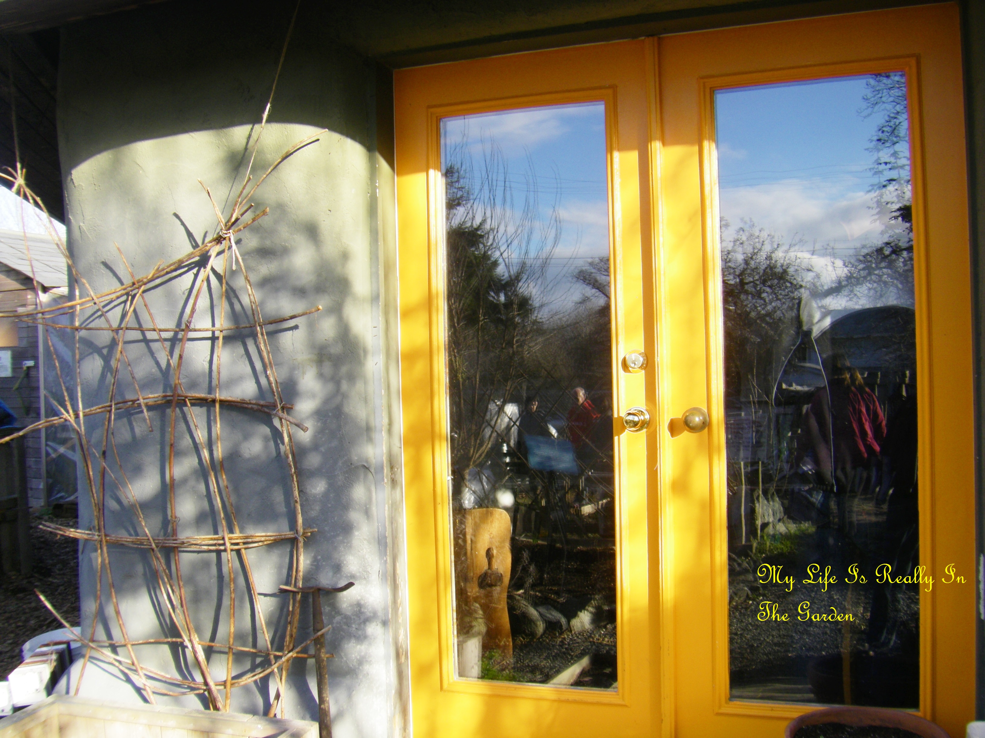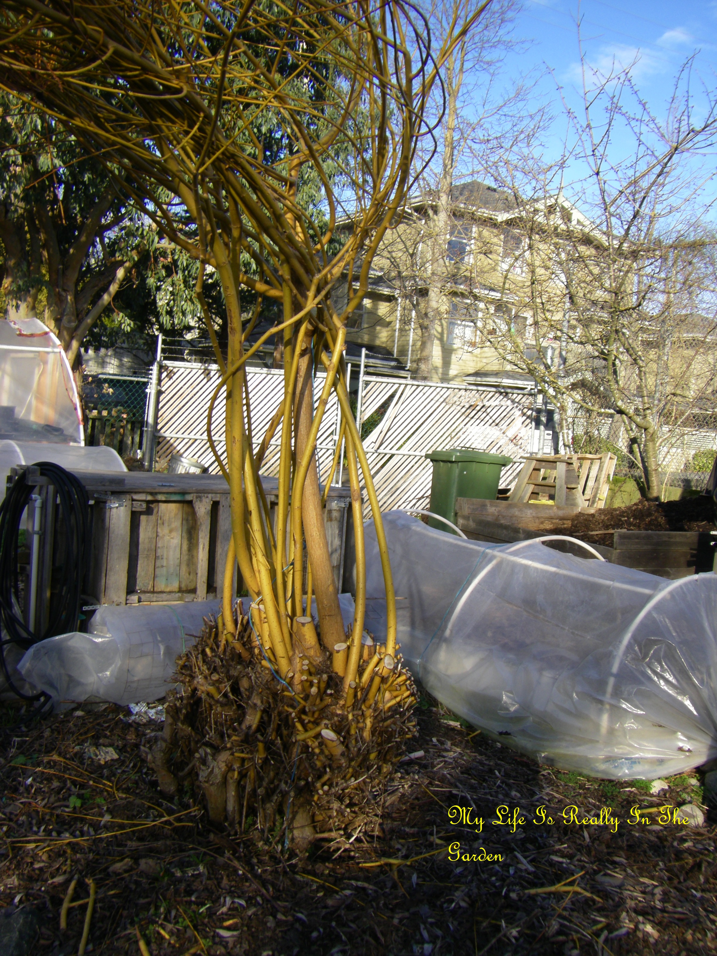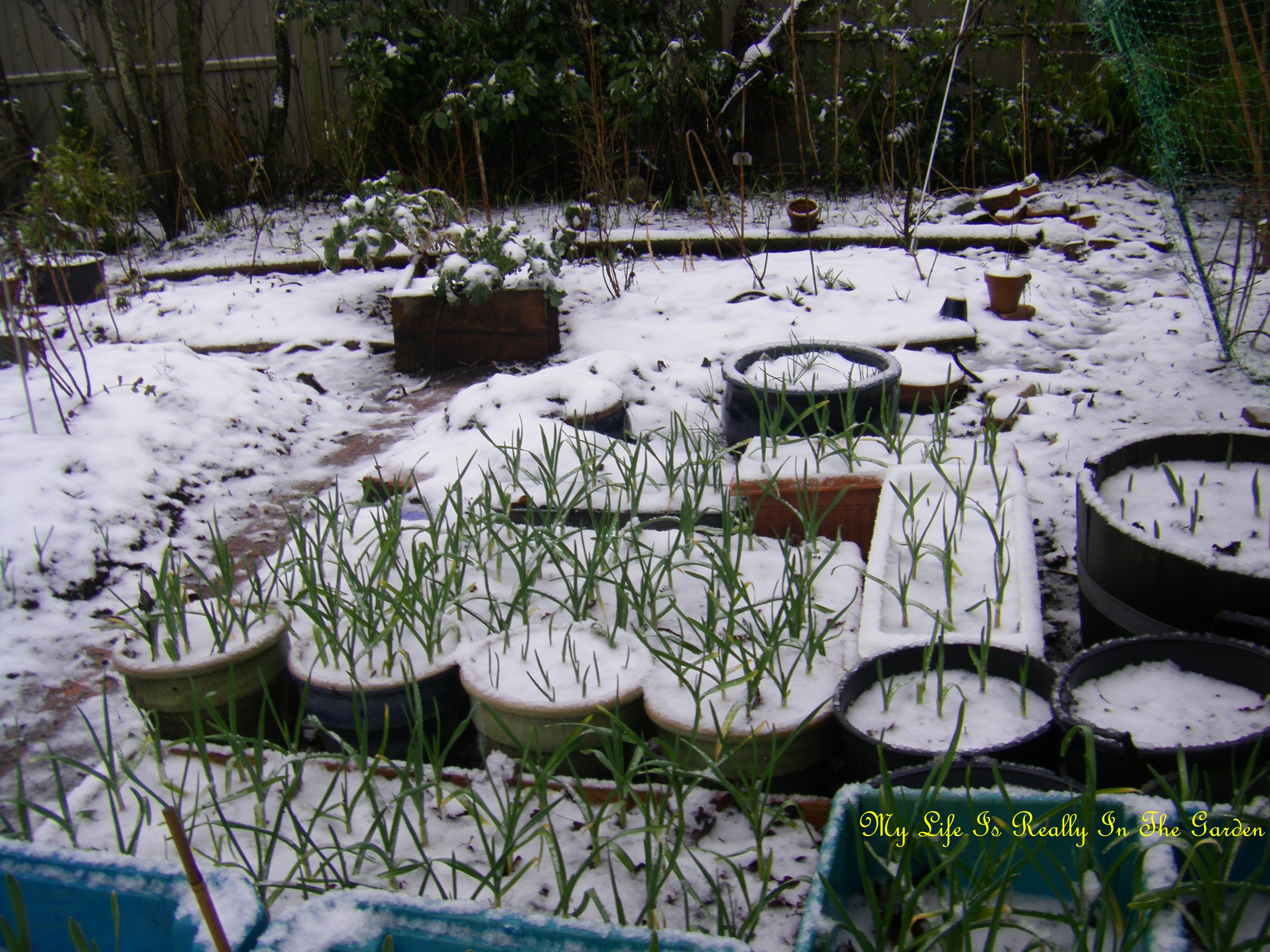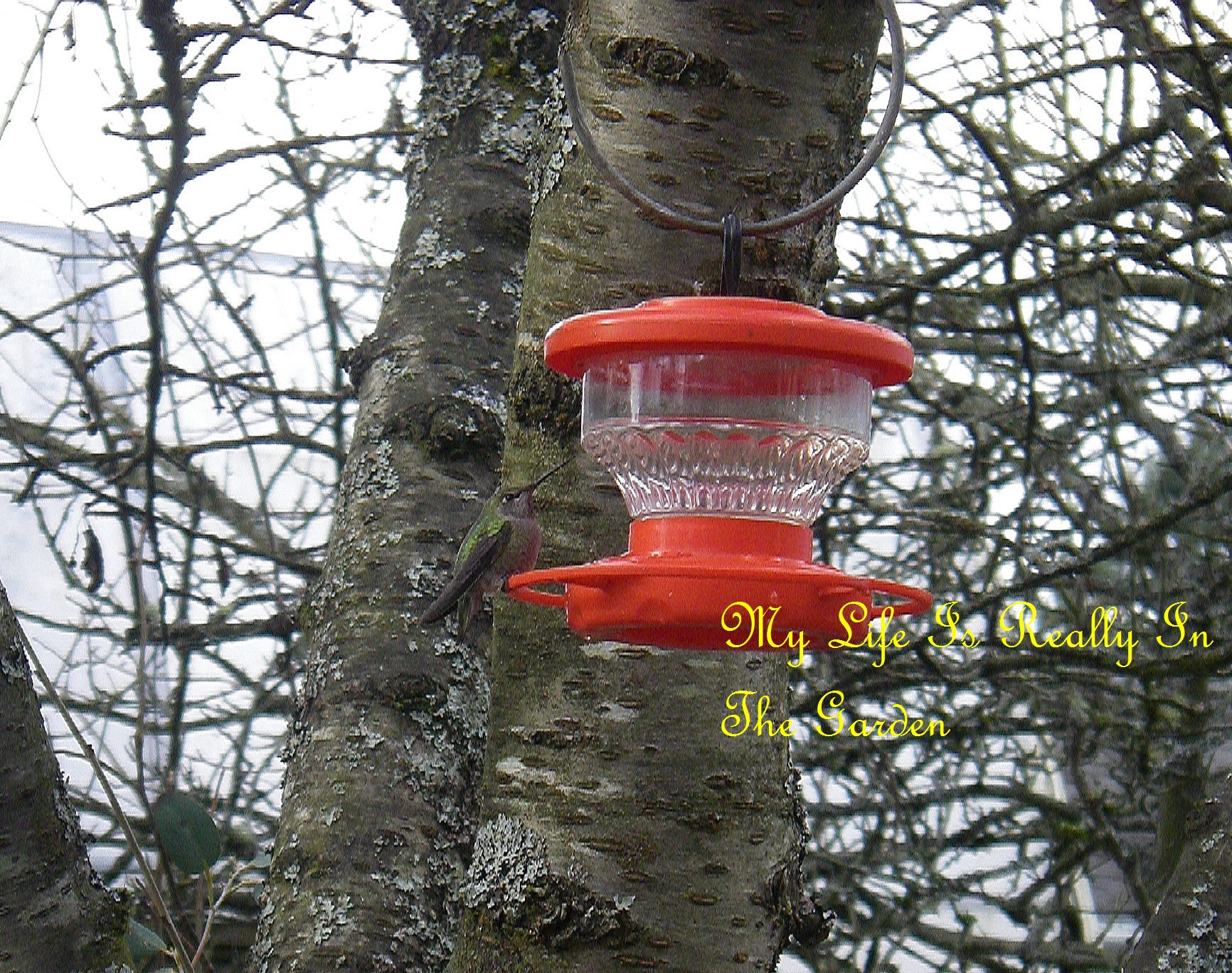 Then I spent a happy few hours, shifting leaf mulch/hay from an area where I had tucked a lot of potted plants into a protected area against the winter. Now it was time to move them aside and dig up the composting material. I drilled holes in the bottom of several waste bins …and later filled them up with the material. Lots of holes so the water can drain and breathe a bit, before I use this lovely stuff throughout the yard.