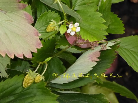 Strawberries are still flowering, bearing fruit even though it is mid-October. This is a wild strawberry, the tiny yellow type which will easily invade your yard if planted. I discovered that this summer. Thought it would be nice to have a few varieties of wild strawberries planted among the veggies. I soon found out that they will send out runners “till the cows come home” and ended up putting some in pots and the rest in the compost. Hmmmmm … I realize that I will be getting a few hundred of these plants next spring from the compost! Well, I can always share them.
