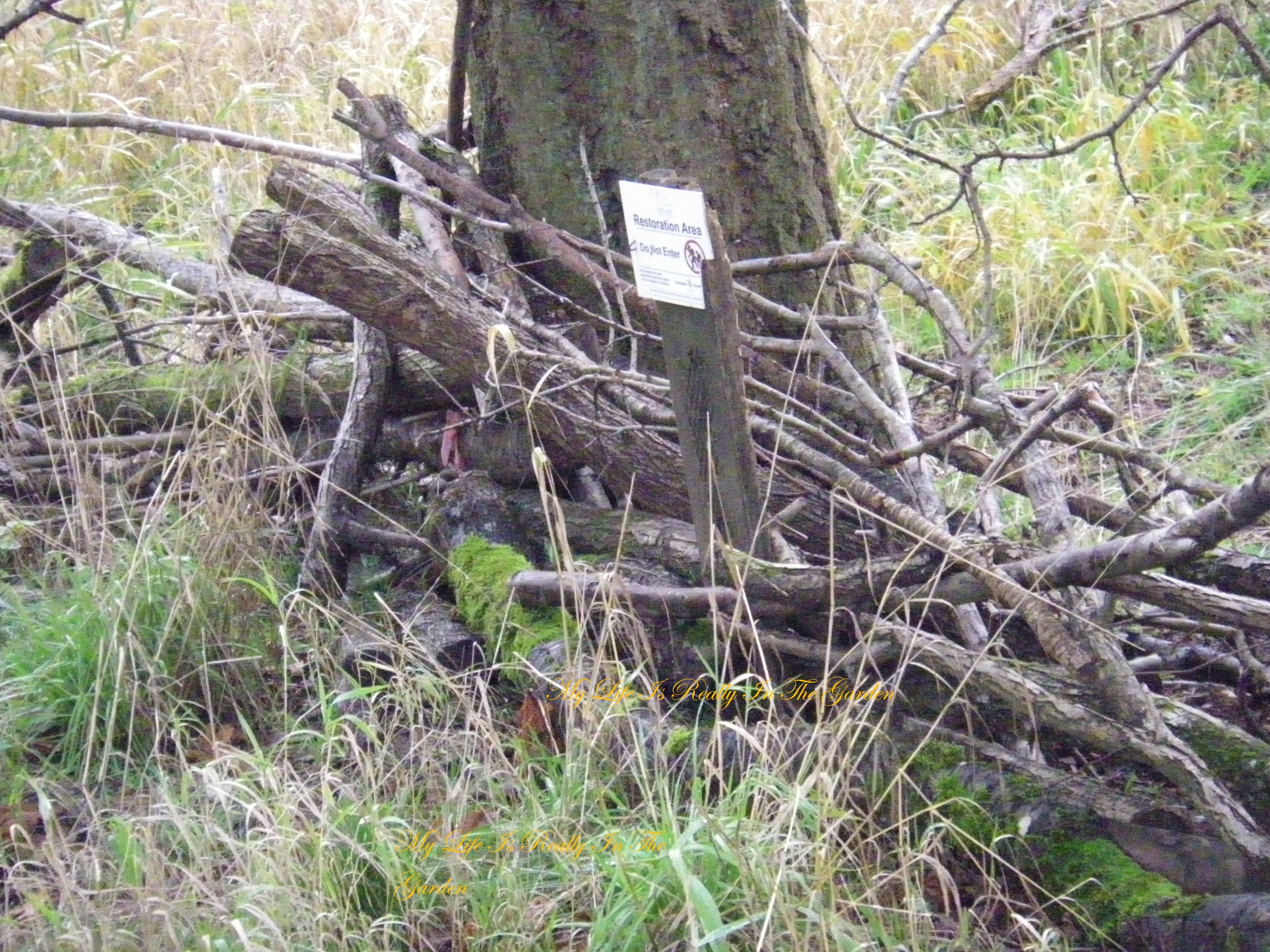A natural fence made of branches, serves to act as a barrier to keep joggers, walkers out of the area, to allow the natural process of growth to take place. I like it.