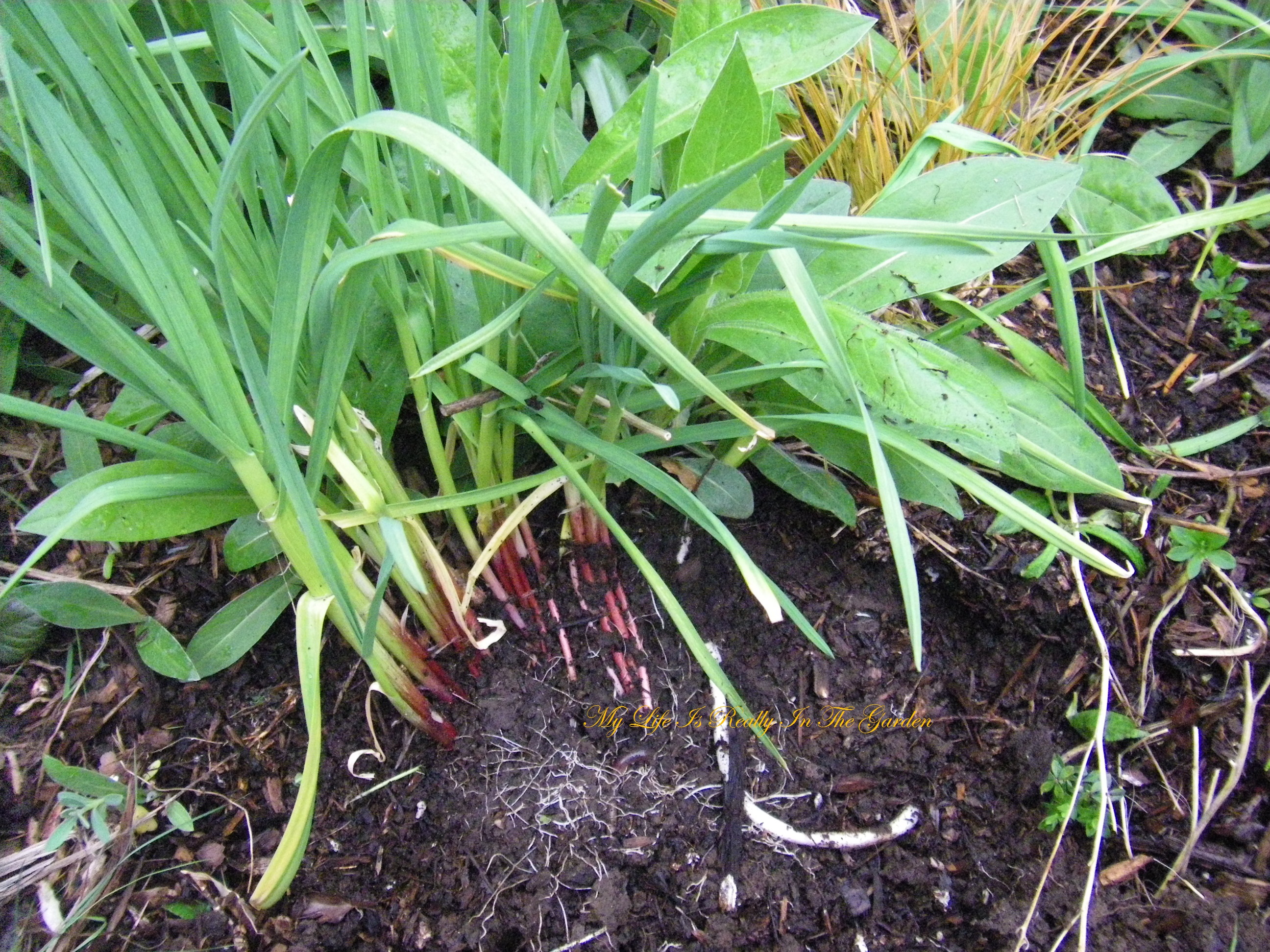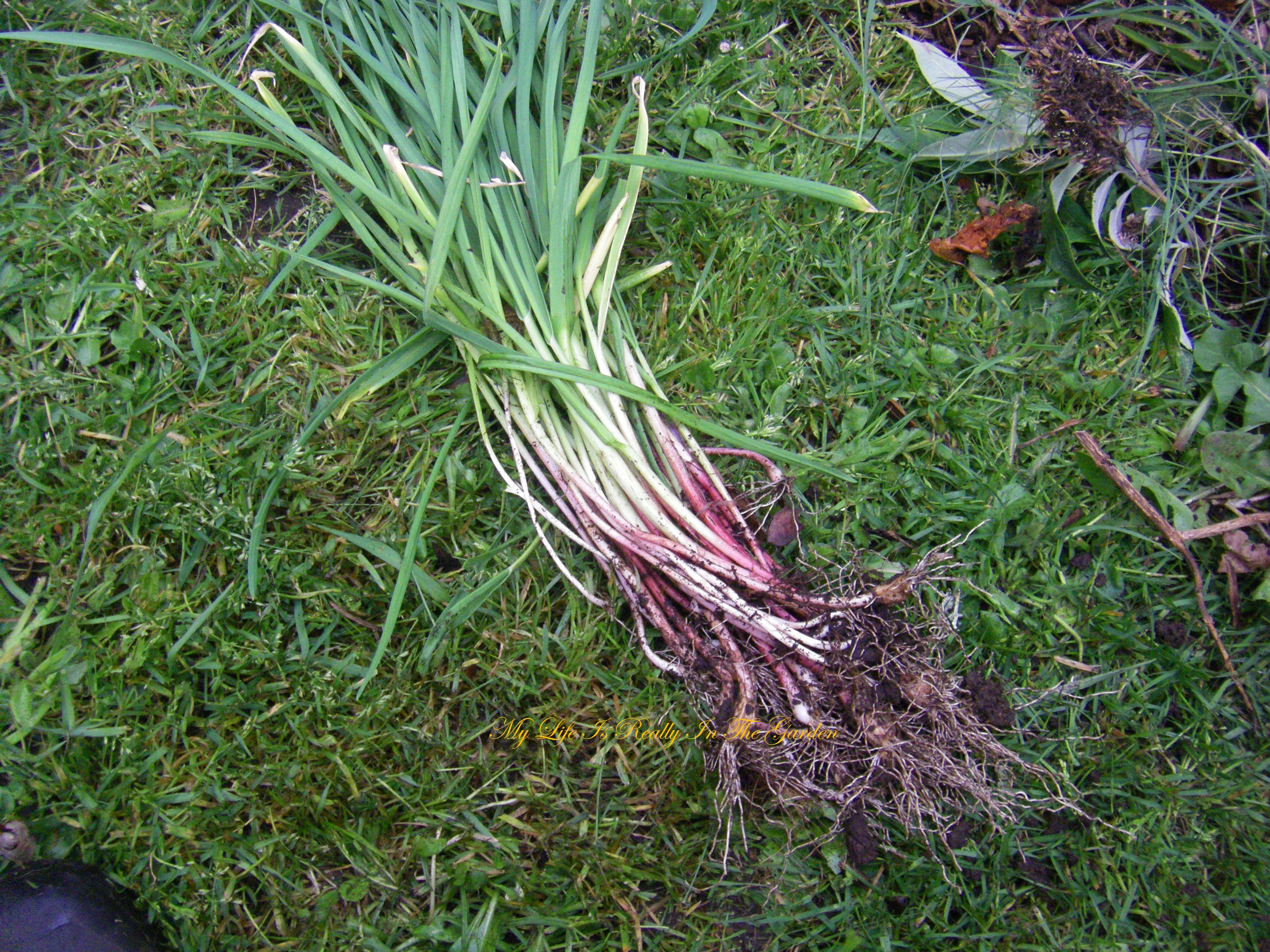 Somehow I missed digging up a few garlic bulbs, how on earth could I have missed them! And so they grew and so I dug them up. All planted now amongst the flowers and I will keep a sharp eye on them this summer!
