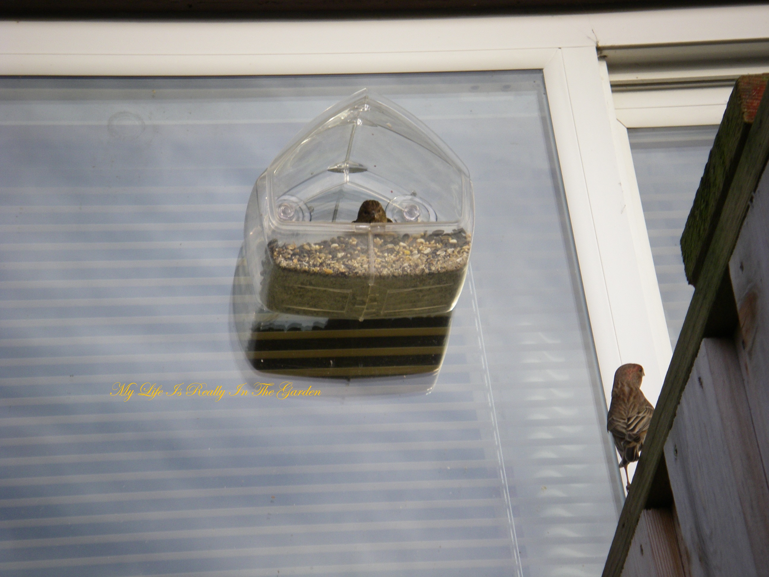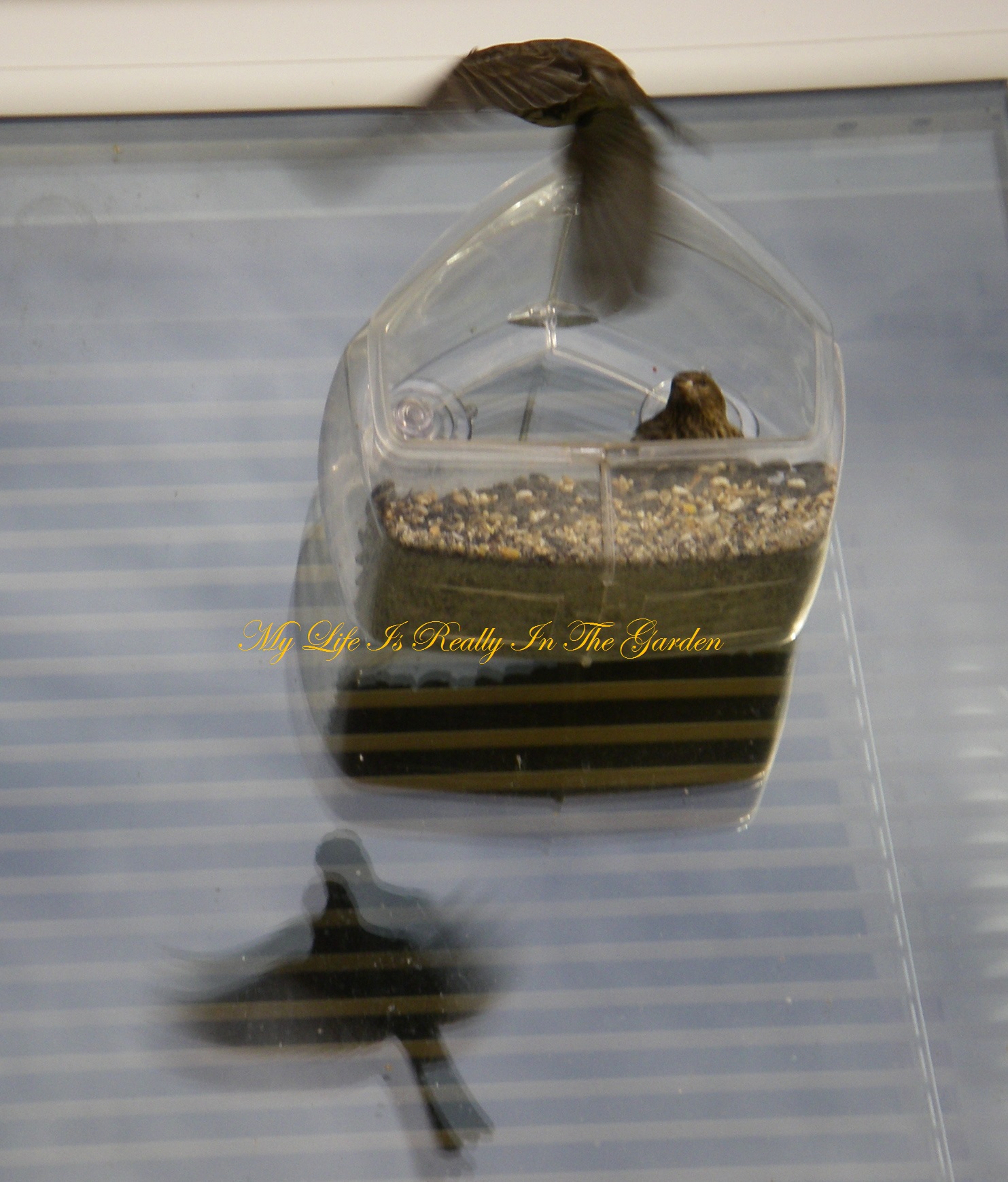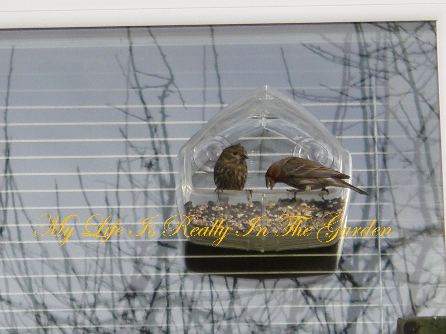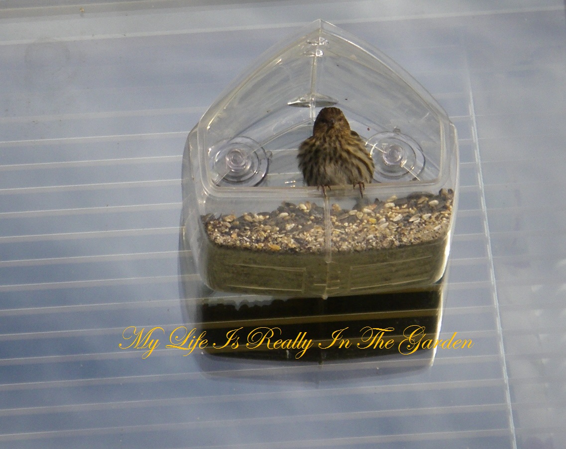 A few days ago, I gathered some pumpkin seeds and scrapings, placed them on a Rubbermaid container lid for the birds to feast on. Our lovely JaneE (nearly 22 years old now) loves pumpkin squash and I caught her eagerly dining on this! She soon stopped and walked away to her little bench. The Stellar Jays noticed this food and quickly made this disappear. I noticed one of the Jays swallow a seed whole, snatched up another and flew away to rest in one of the trees!