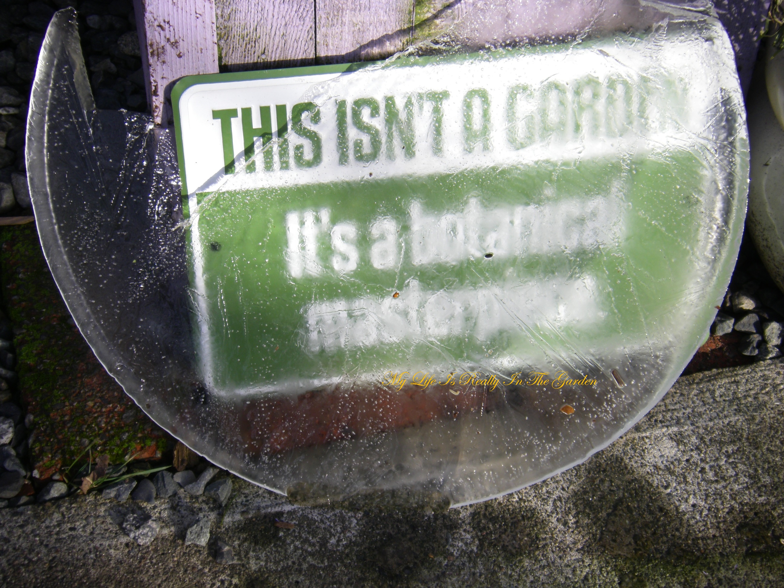 Leaves decorating the frozen water in the bird bath. I replenished the water so that the birds could bathe.