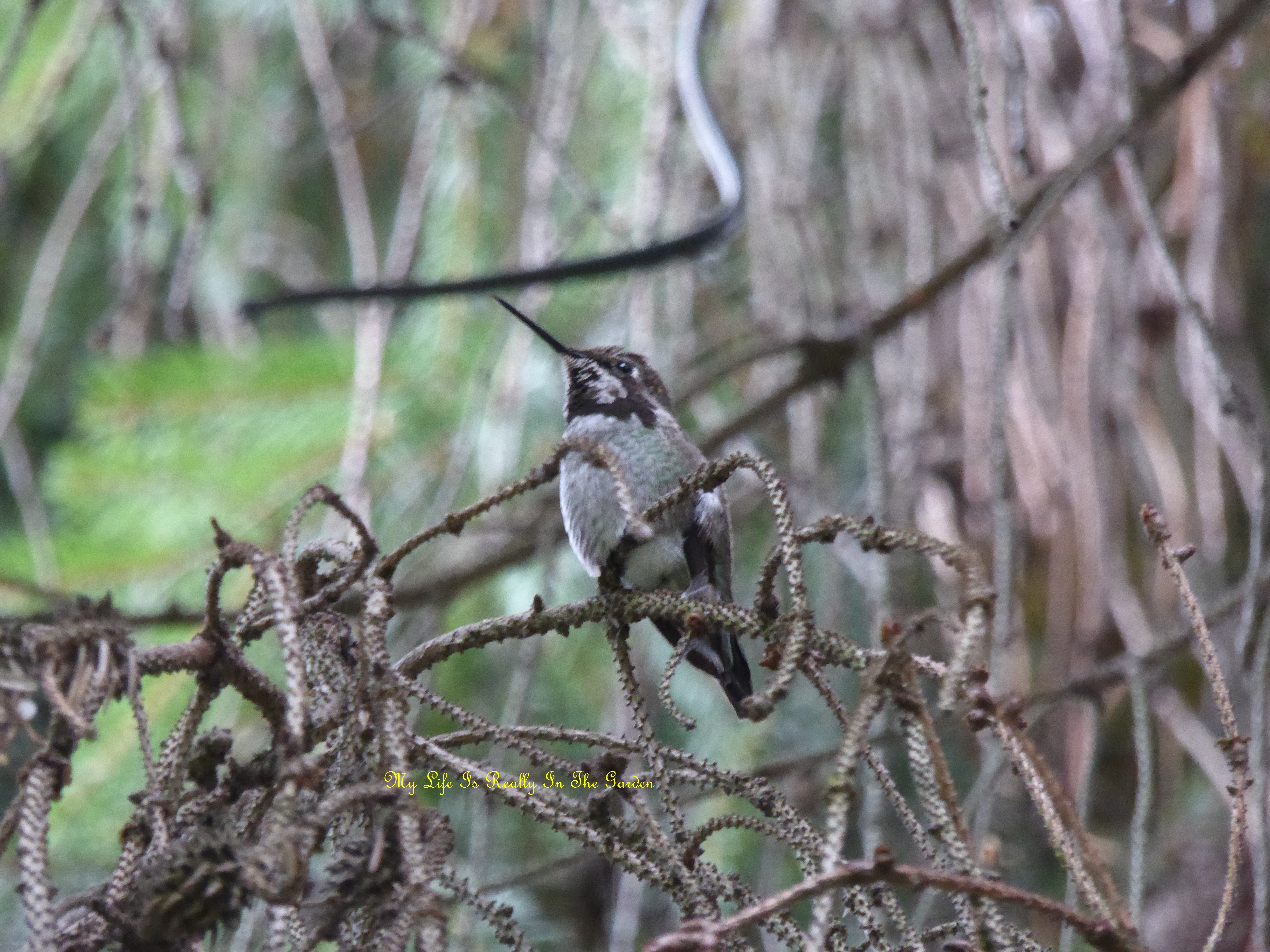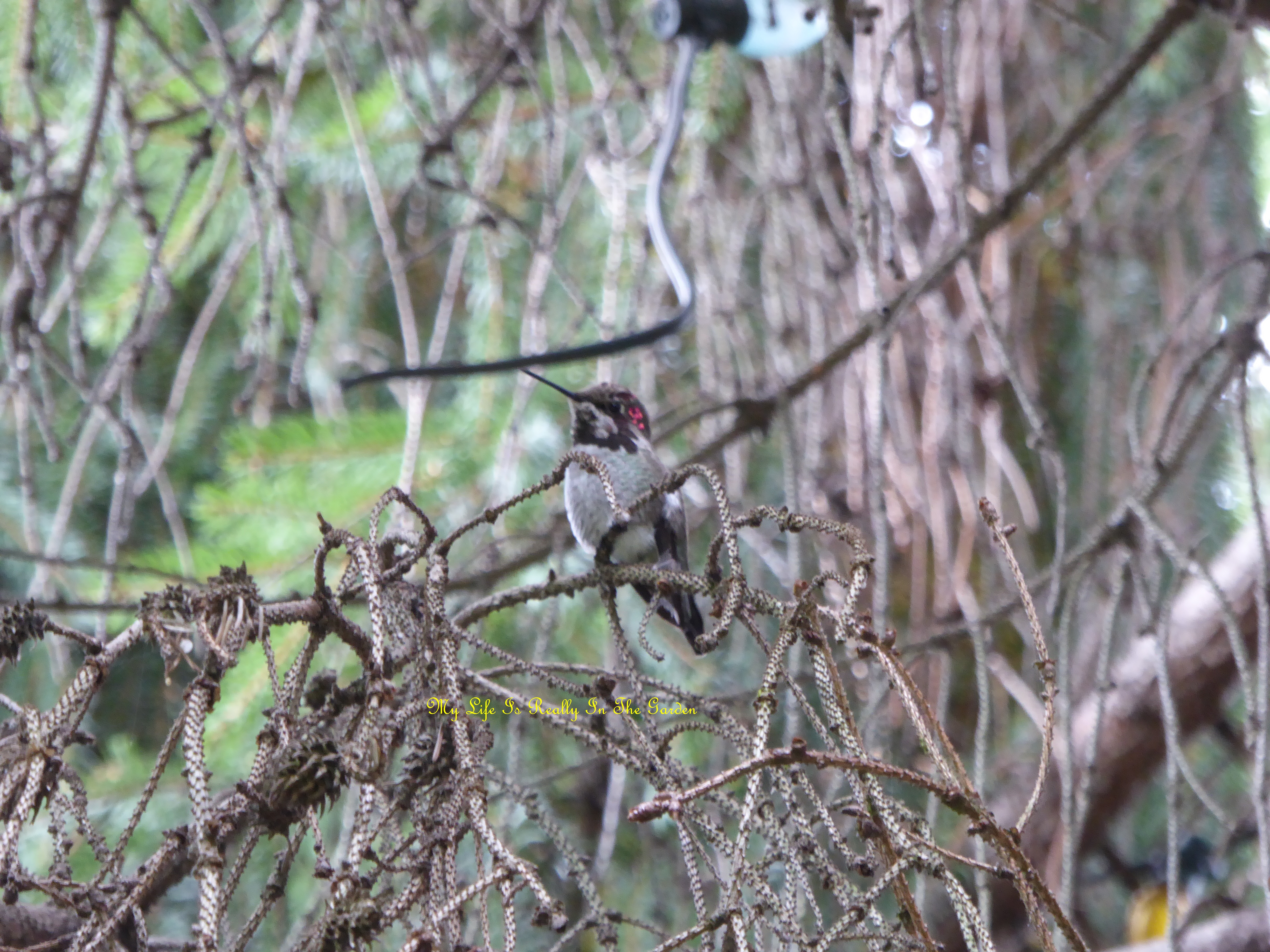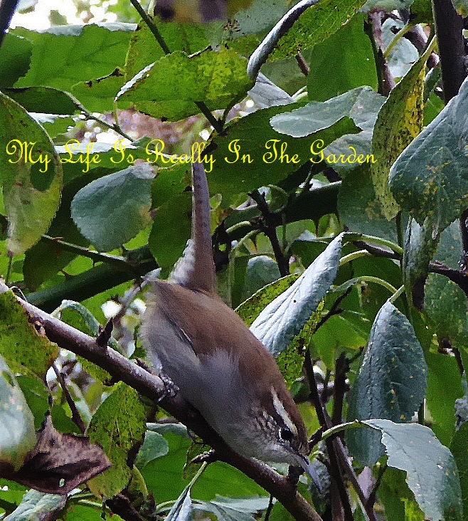 My dwarf weeping willow had many fluffy catkins, which the Bewick Wrens gathered for their nest .. which is tucked away on a bush in the yard!